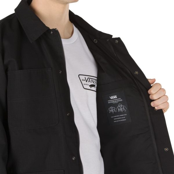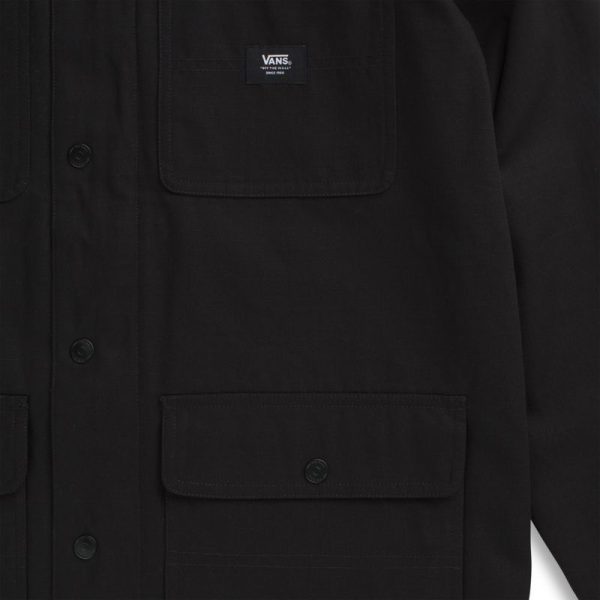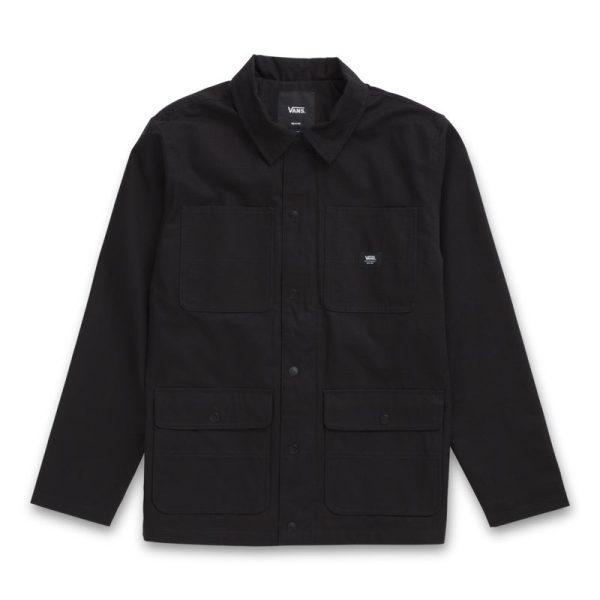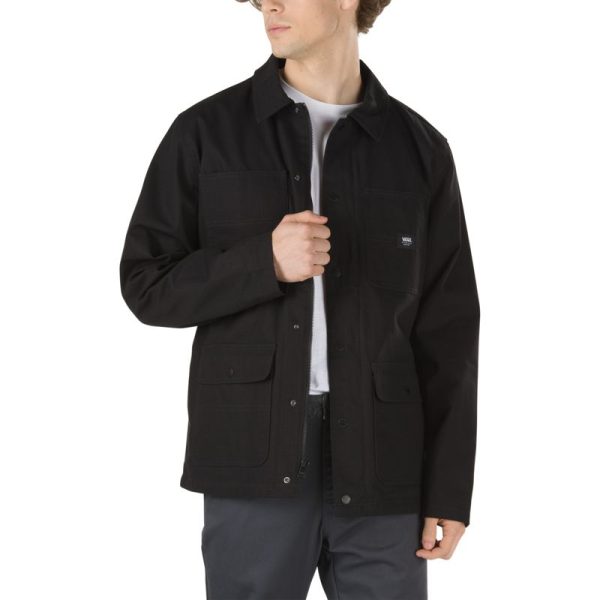 Vans improves the classic chore coat and makes it tough enough for skateboarders. Taken from the workshops of hard labor and tweaked to be more durable, enhanced to repel water, and toughened up for the everyday grind, the Drill Chore Coat Lined features Durable Water Repellent coating and an invisible hood that folds into the body through a hidden zipper at the interior neckline. It also includes a low-profile snap-front placket with a hidden zipper closure, dual entry pockets, and a woven label at the chest pocket. Model is 6 feet tall and wearing a size Medium.