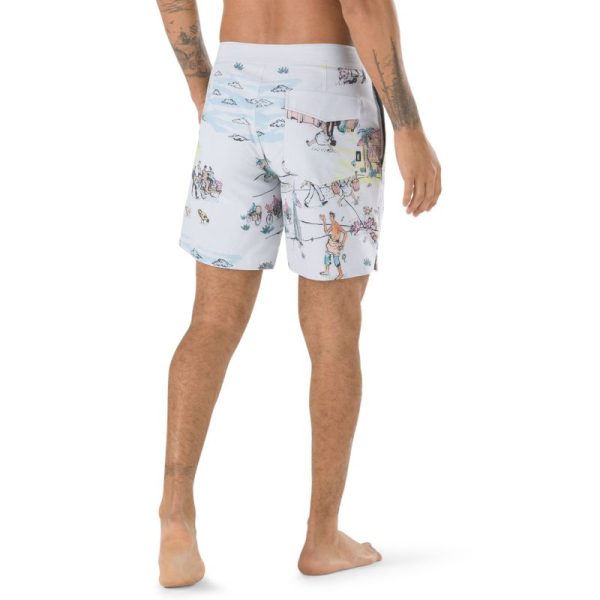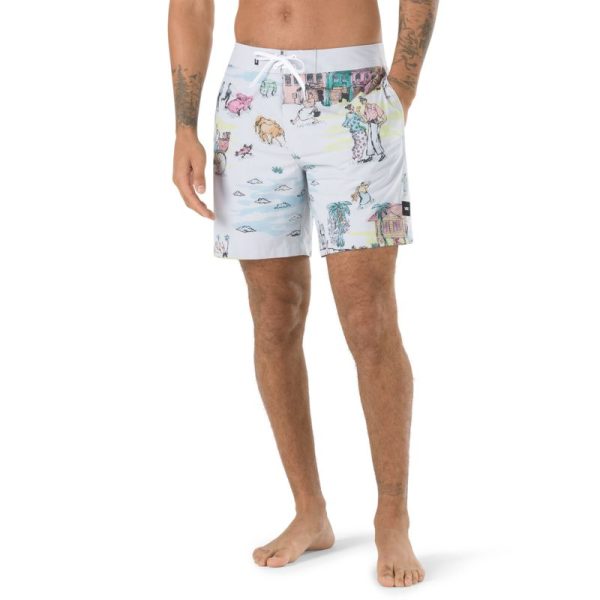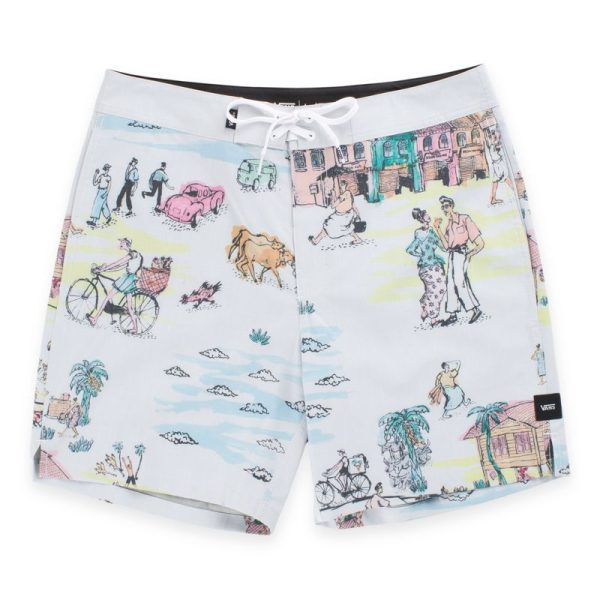 We’ve teamed up with Malaysian artist and winner of the Custom Culture contest in the Asian Pacific Region, Kide Baharudin, to deliver an original take on Vans culture and Off The Wall spirit. Kide’s illustrations depict a deep exploration into the relationship between human characters, their local culture, and history. In the Kide Boardshort 17″, Kide’s expressive talent is brought to life through a richly colorful print showcasing the lively coastal villages of his home country. It also features a classic cotton aesthetic with the modern-day comfort of 4-way stretch, a soft hand feel and quick dry time, side entry hand pockets, a rear patch pocket, and a Vans woven label at the knee. Model is 6 feet tall and wearing a size 32.