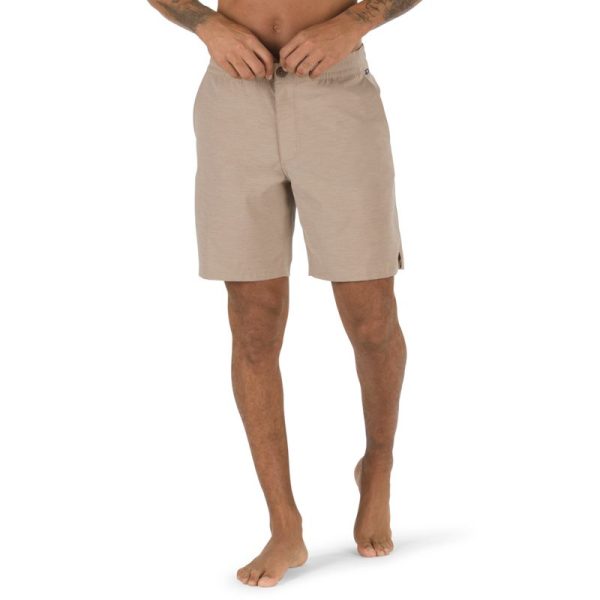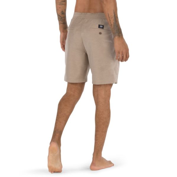 The Microplush Decksider 18 is a 73% polyester, 24% cotton, and 3% elastane microplush tri-blend decksider short that combines a classic cotton aesthetic with the modern-day comfort of 4-way stretch. It also includes an elastic waist, side entry hand pockets, rear welt pockets with a zip closure on the left pocket, and a Vans branded woven label at rear. Model is 6 feet tall and wearing a size 32.