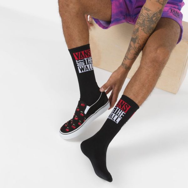 The New Stax Crew Sock is a 69% cotton, 25% nylon, 5% elastodiene, and 1% elastane crew sock with jacquard art and a Vans logo.