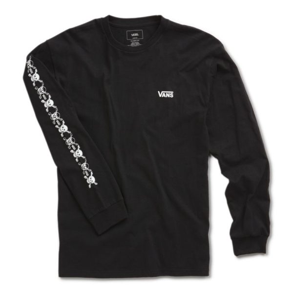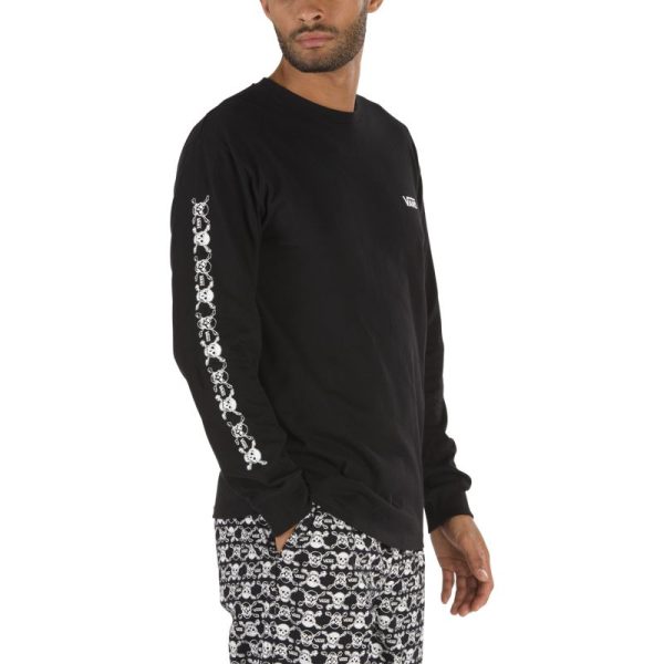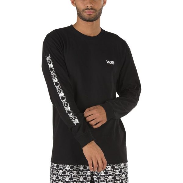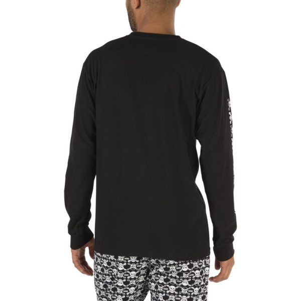 The Anaheim Factory OG Skull Long Sleeve T-Shirt is a 100% carded ringspun cotton t-shirt with long sleeves and graphics at the left chest and sleeve. Model is 6 feet tall and wearing a size Medium.