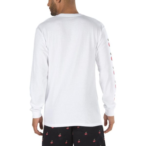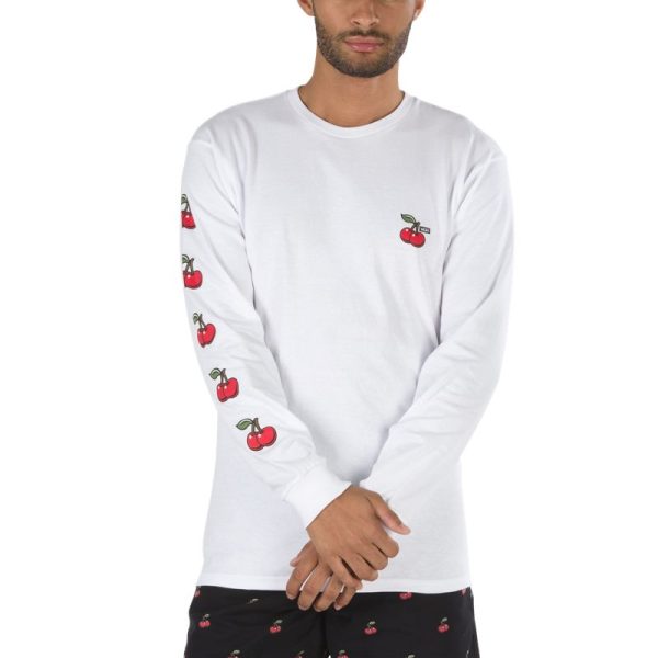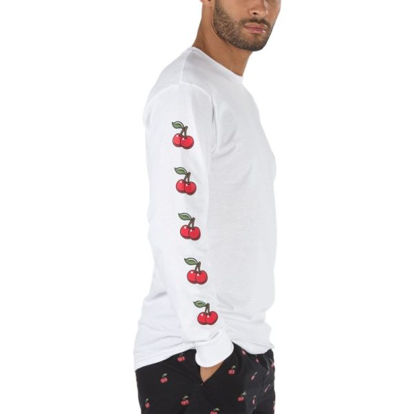 The Cherries Long Sleeve T-Shirt is a heavier weight 100% carded ringspun cotton t-shirt with long sleeves and chest and sleeve graphics. Fit type: classic. Model is 6 feet tall and wearing a size Medium.