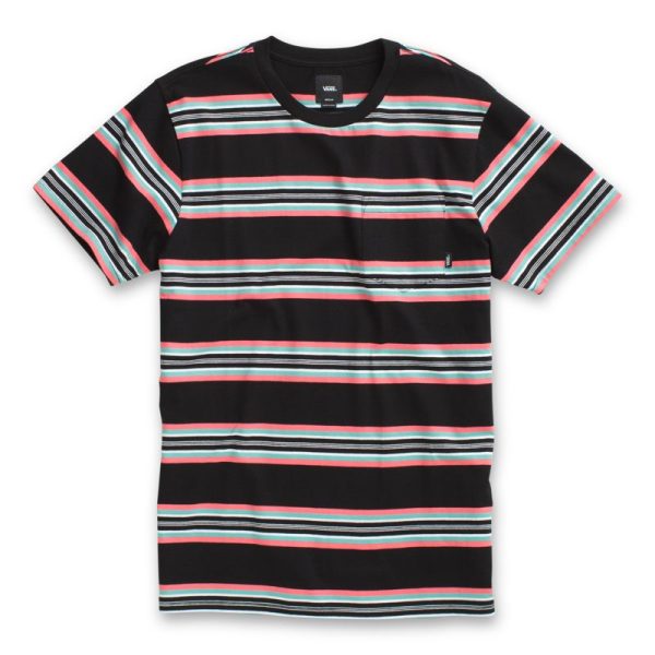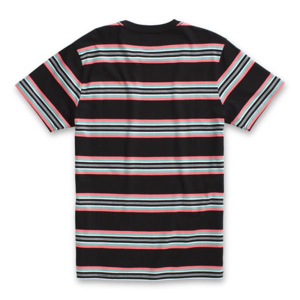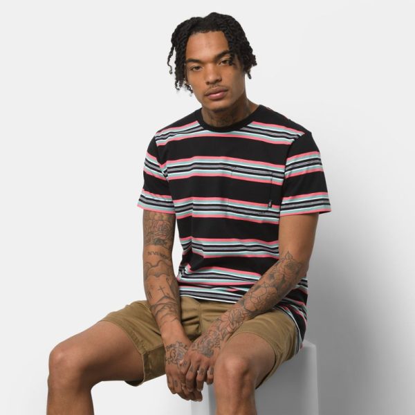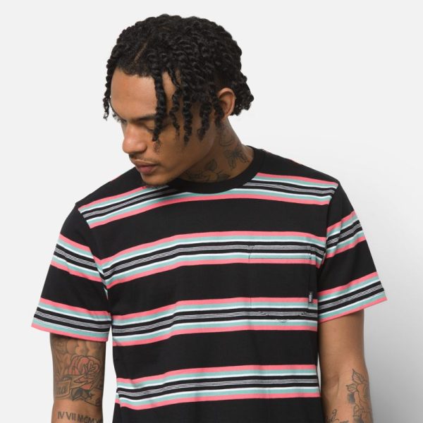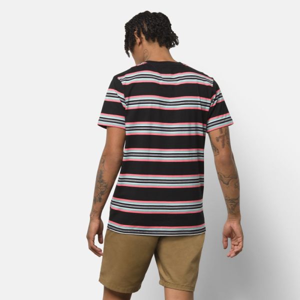 The Emory Shirt is a 100% BCI cotton jersey crewneck t-shirt with short sleeves, a chest pocket, and yarn dyed retro stripes. Model is 6 feet tall and wearing a size Medium.