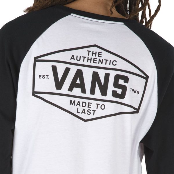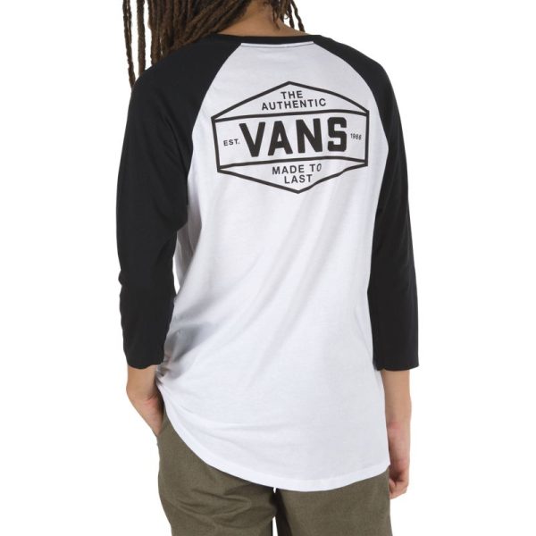 The Vans Standard Raglan T-Shirt is a 100% combed ringspun cotton raglan t-shirt with three-quarter sleeves and left chest and back graphics. Fit type: slim. Model is 6 feet tall and wearing a size Medium.