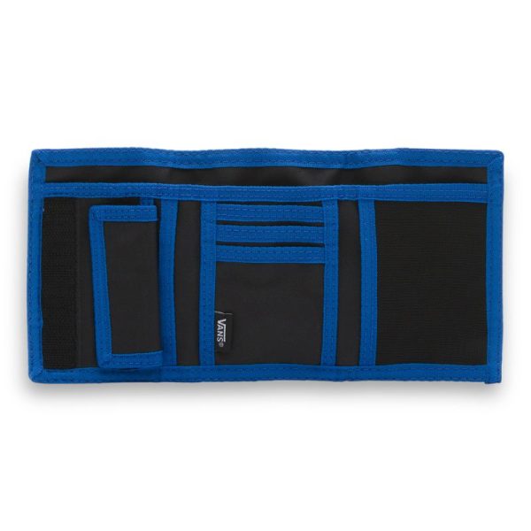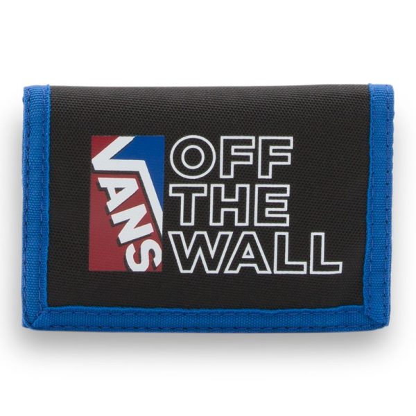 The Slipped Wallet is a 100% polyester tri-fold wallet with a Vans logo print. It features an ample billfold, card slots, an ID window, and a coin pocket.