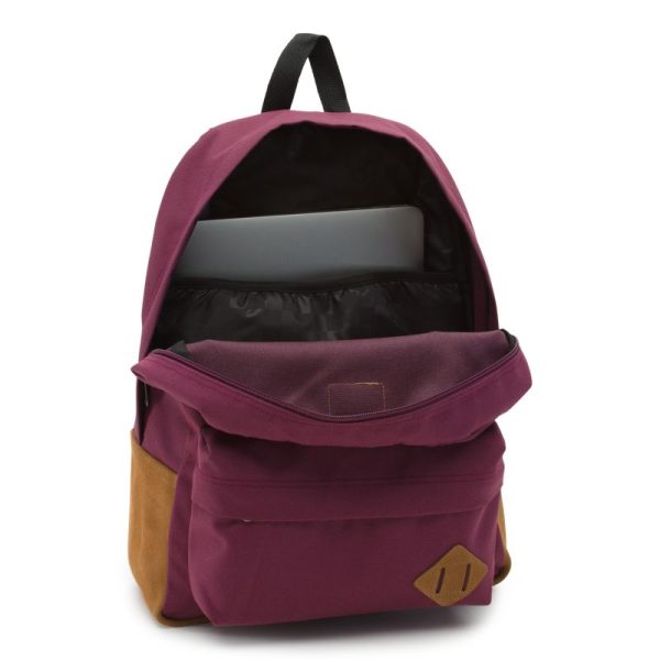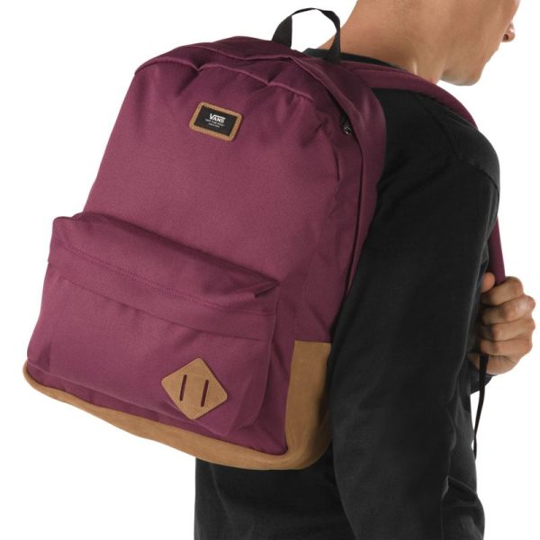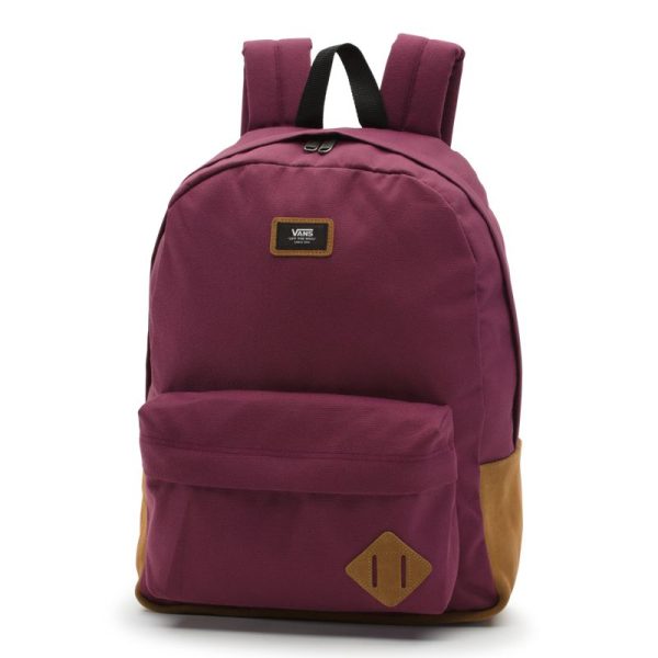 The Old Skool Backpack is a 100% polyester backpack featuring 100% suede leather trim, one large main compartment with a laptop sleeve (fits most 15” laptops), a front zip pocket with an organizer for quick access, and straight-cut padded shoulder straps. Measuring 16.5 L x 12.75 W x 4.75 D inches, it has a 22-liter capacity.