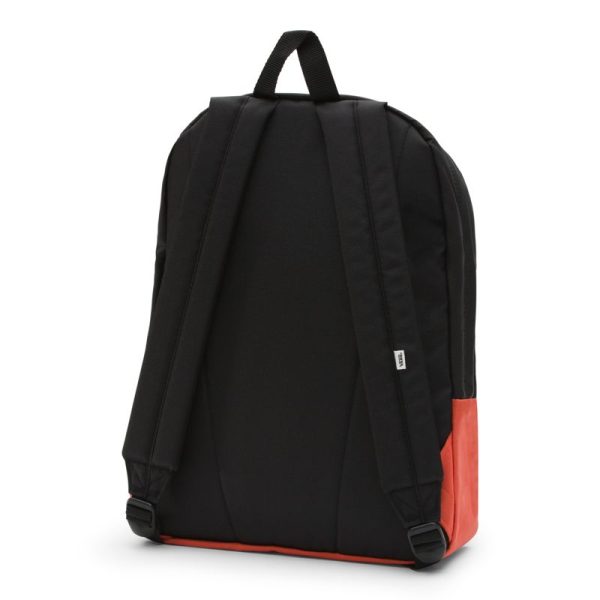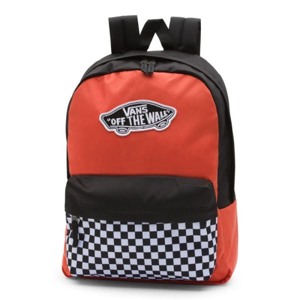 The Realm Backpack is a 60% polyester, 40% recycled polyester two-pocket backpack featuring a zippered main compartment with an interior laptop sleeve, a front pocket with an organizer, adjustable padded shoulder straps, and a checkerboard print. Measuring 16.75 H x 12.75 W x 4.75 D inches, it has a 22-liter capacity.
