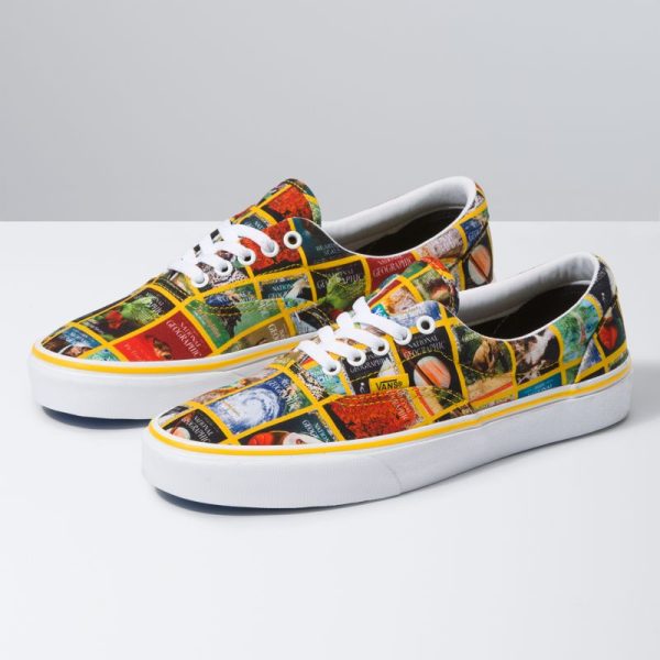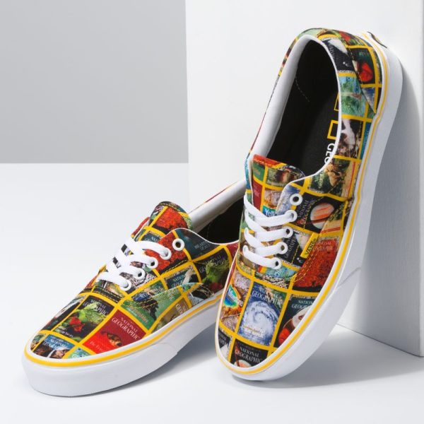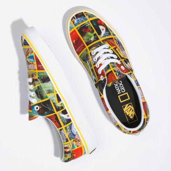 Vans and National Geographic come together for a collection of footwear and apparel that celebrates over 130 years of the never-ending quest to explore our planet. Honoring National Geographic’s longstanding tradition of seeking and storytelling, the Vans X National Geographic Era combines the Vans classic low top skate shoe with organic cotton uppers and an allover National Geographic Magazine print. It also includes metal eyelets, padded collars for support and flexibility, and signature rubber waffle outsoles.