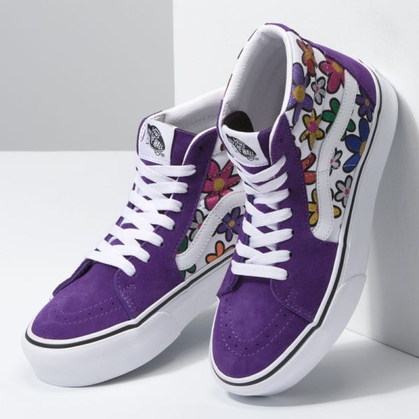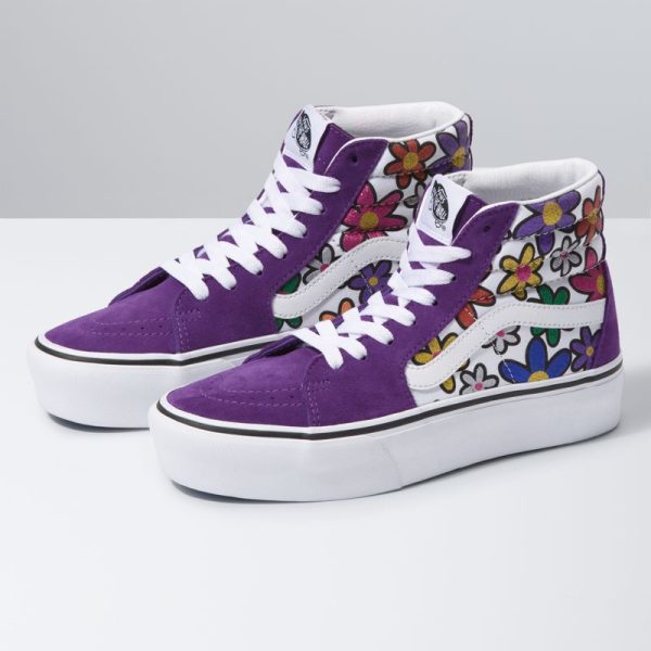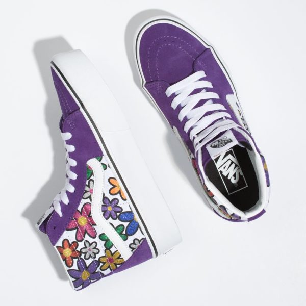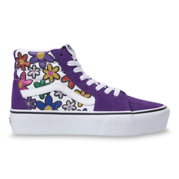 The Glitter Daisies Sk8-Hi Platform 2.0 combines the legendary Vans lace-up high top with printed canvas and suede uppers, platform sidewalls, and signature rubber waffle outsoles. It also includes re-enforced toecaps to withstand repeated wear, and padded collars for support and flexibility.