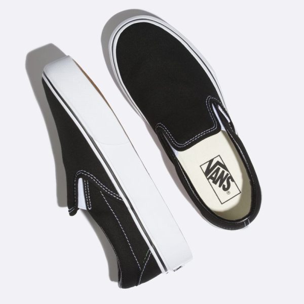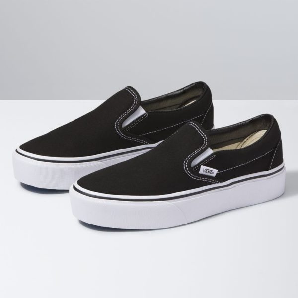 The Classic Slip-On Platform features sturdy low profile slip-on canvas uppers, padded collars, elastic side accents, and platform signature rubber waffle outsoles.