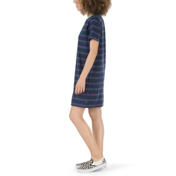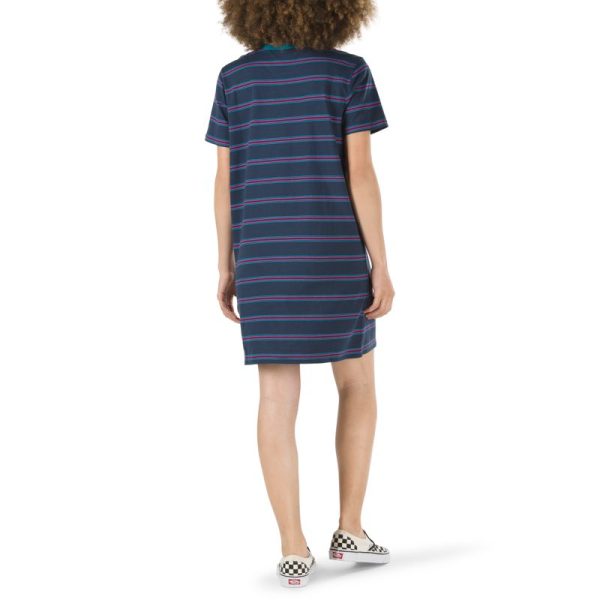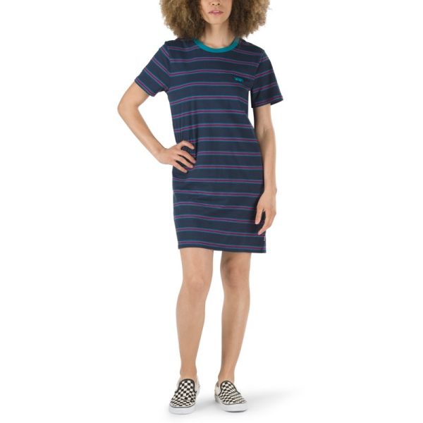 The Kaye Stripe Tee Dress is a 100% cotton t-shirt dress with short sleeves, allover yarn dyed stripes, a contrast neck, and logo embroidery at chest. Model is 5 feet 9 inches tall and wearing a size Small.