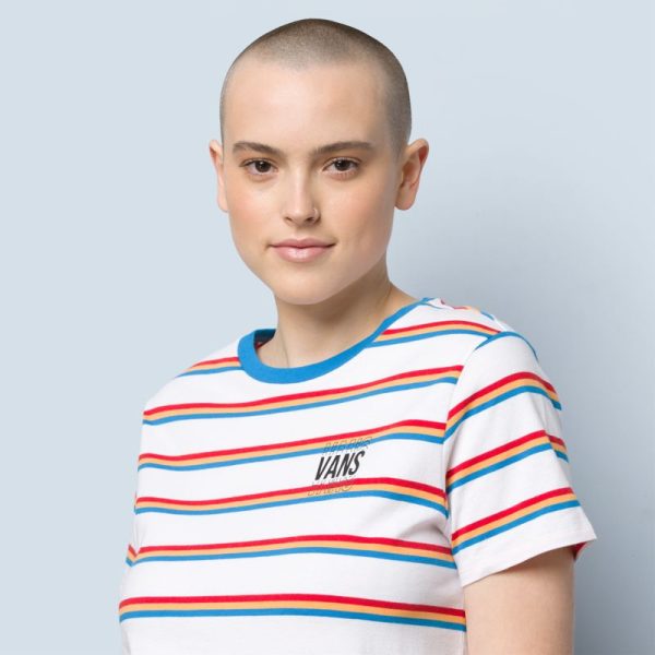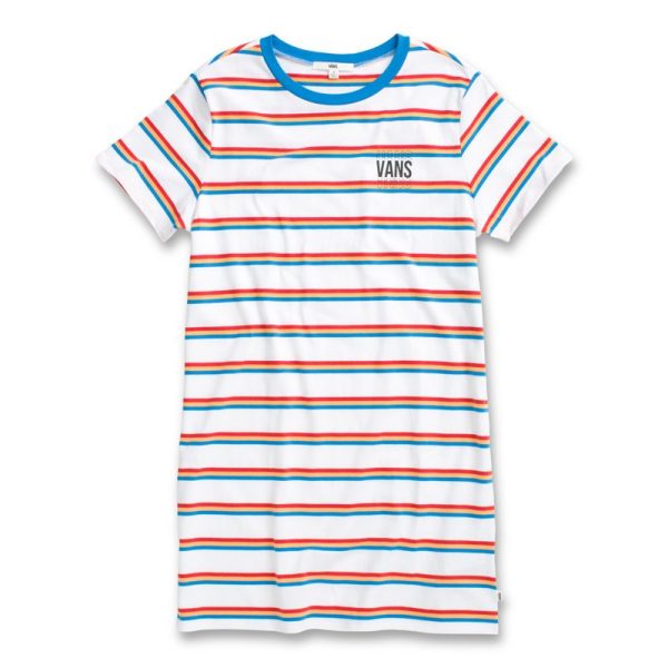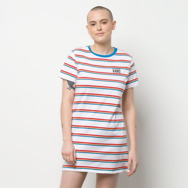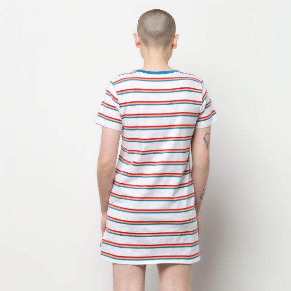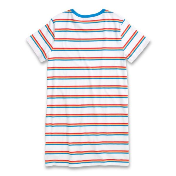 The Long Way Tee Dress is a 100% cotton short sleeve t-shirt dress with yarn dyed stripes, a contrast neck, and a logo screen print at the chest. Model is 5 feet 9 inches tall and wearing a size Small.