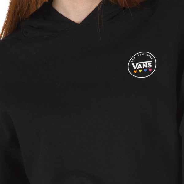 The Glow Stax Crop Hoodie is an 84% cotton, 16% polyester French terry pullover hooded sweatshirt with exaggerated sleeves, a novelty logo screen print at the chest, a drawcord and toggle at the hem, and an oversized, cropped fit. Model is 5 feet 9 inches tall and wearing a size Small.