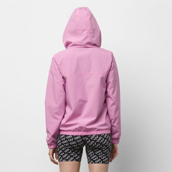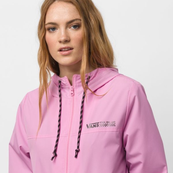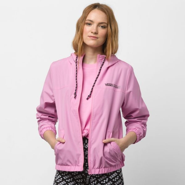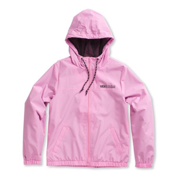 The Kastle Turvey Windbreaker is a 100% polyester zip-up windbreaker with a hood, mesh lining, a two-tone drawcord, and a logo screen print at the chest. Model is 5 feet 9 inches tall and wearing a size Small.