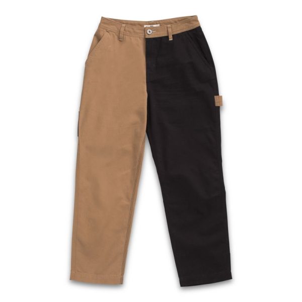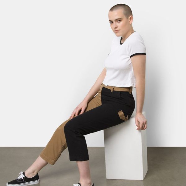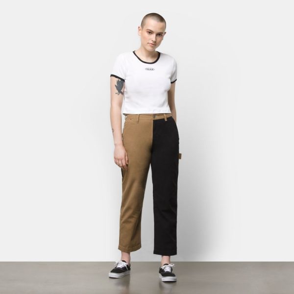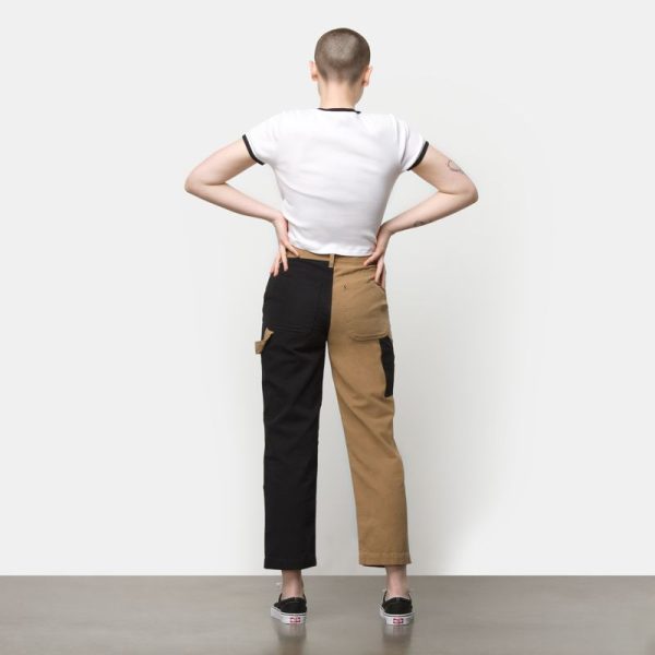 The Grunge Glam Pant is a 100% cotton canvas workwear-inspired carpenter pant with colorblock paneling and pop color bar tacks. Model is 5 feet 9 inches tall, has a 23-inch waist, and is wearing a size 26.