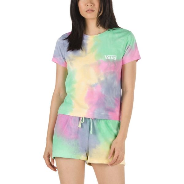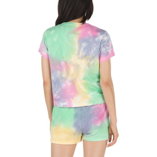 The Aura Baby T-Shirt is a 100% cotton baby tee with an allover tie-dye aura wash and chest logo graphics. Model is 5 feet 9 inches tall and wearing a size Small.