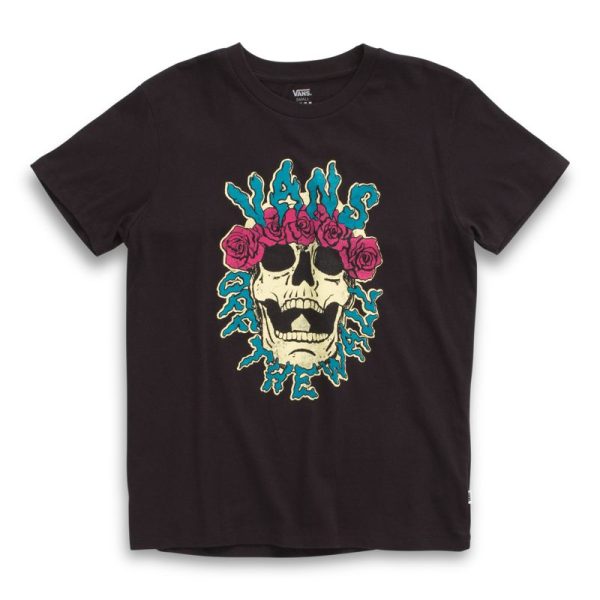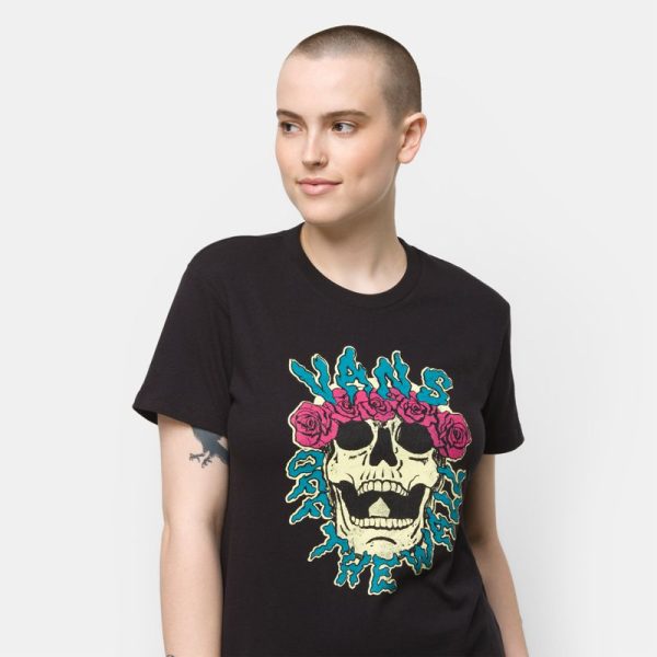 The Brancho Boyfriend T-Shirt is a heavy 100% cotton jersey boyfriend tee with floral skull graphics at the front. Model is 5 feet 9 inches tall and wearing a size Small.