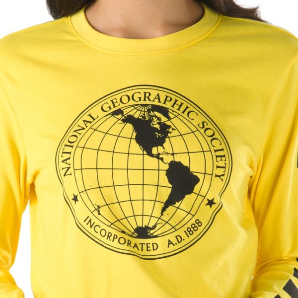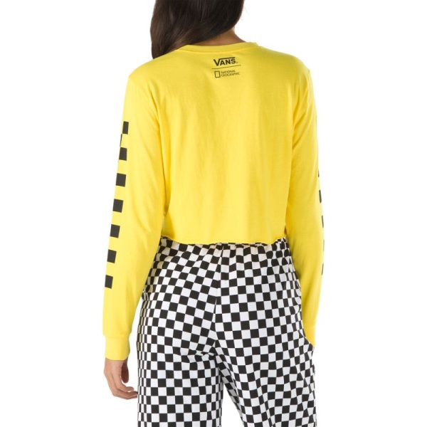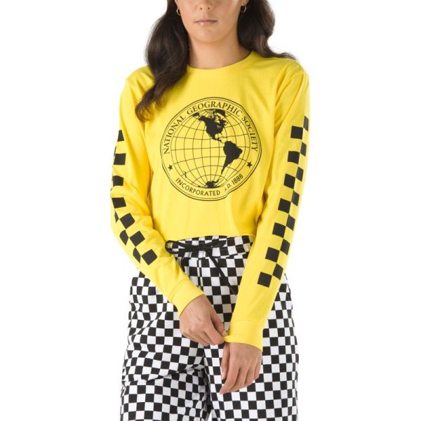 Vans and National Geographic come together for a collection of footwear and apparel that celebrates over 130 years of the never-ending quest to explore our planet. Honoring National Geographic’s longstanding tradition of seeking and storytelling, the Vans X National Geographic Long Sleeve Cropped T-Shirt features a cropped fit and the iconic National Geographic seal that dates back to the Society’s founding in 1888. It also includes checkerboard graphics at the sleeves. Discover the different styles in this collection, and become inspired to explore our planet. Model is 5 feet 9 inches tall and wearing a size Small.