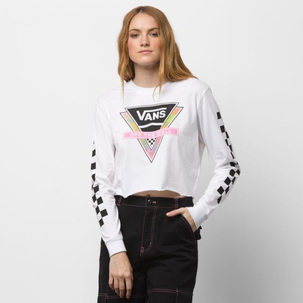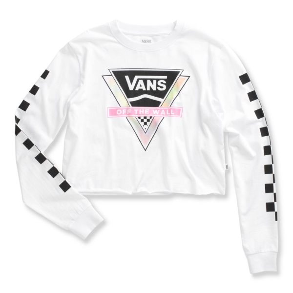 The Try Angle T-Shirt is a 100% cotton long sleeve tee with logo graphics at the chest, checkerboard graphics at the sleeves, and a cropped fit. Model is 5 feet 9 inches tall and wearing a size Small.