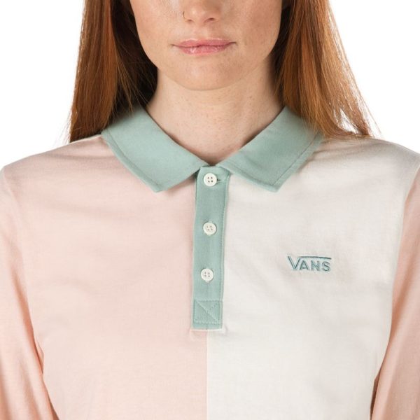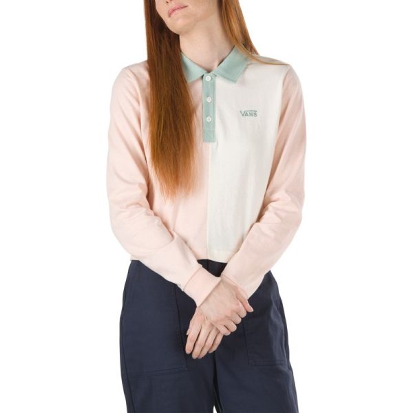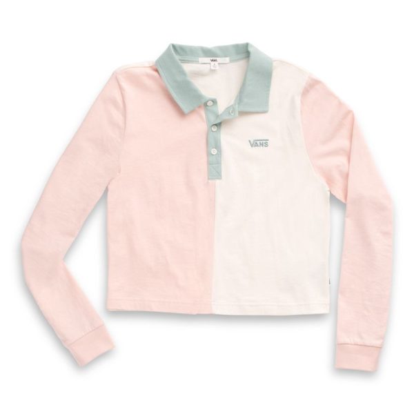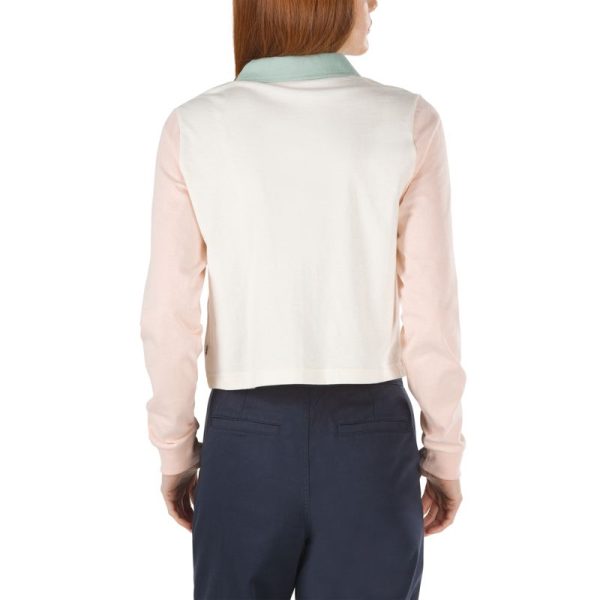 The Core Skate Long Sleeve Crop Polo is a 100% cotton cropped polo shirt with long sleeves, colorblocking, a contrast collar, and logo embroidery at the chest. Model is 5 feet 9 inches tall and wearing a size Small.